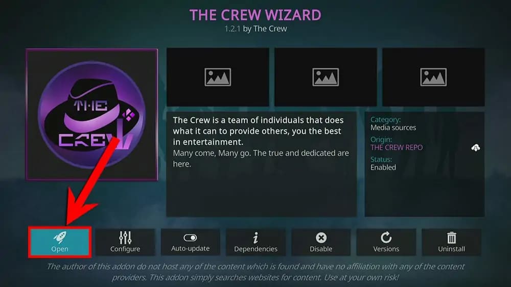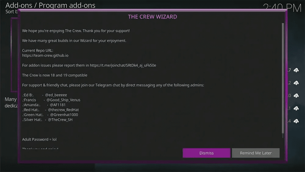 You’ll see a confirmation message in the screen’s top-right corner that The Crew Wizard addon is installed. A message will appear on the screen after a few moments. Read then dismiss the message.